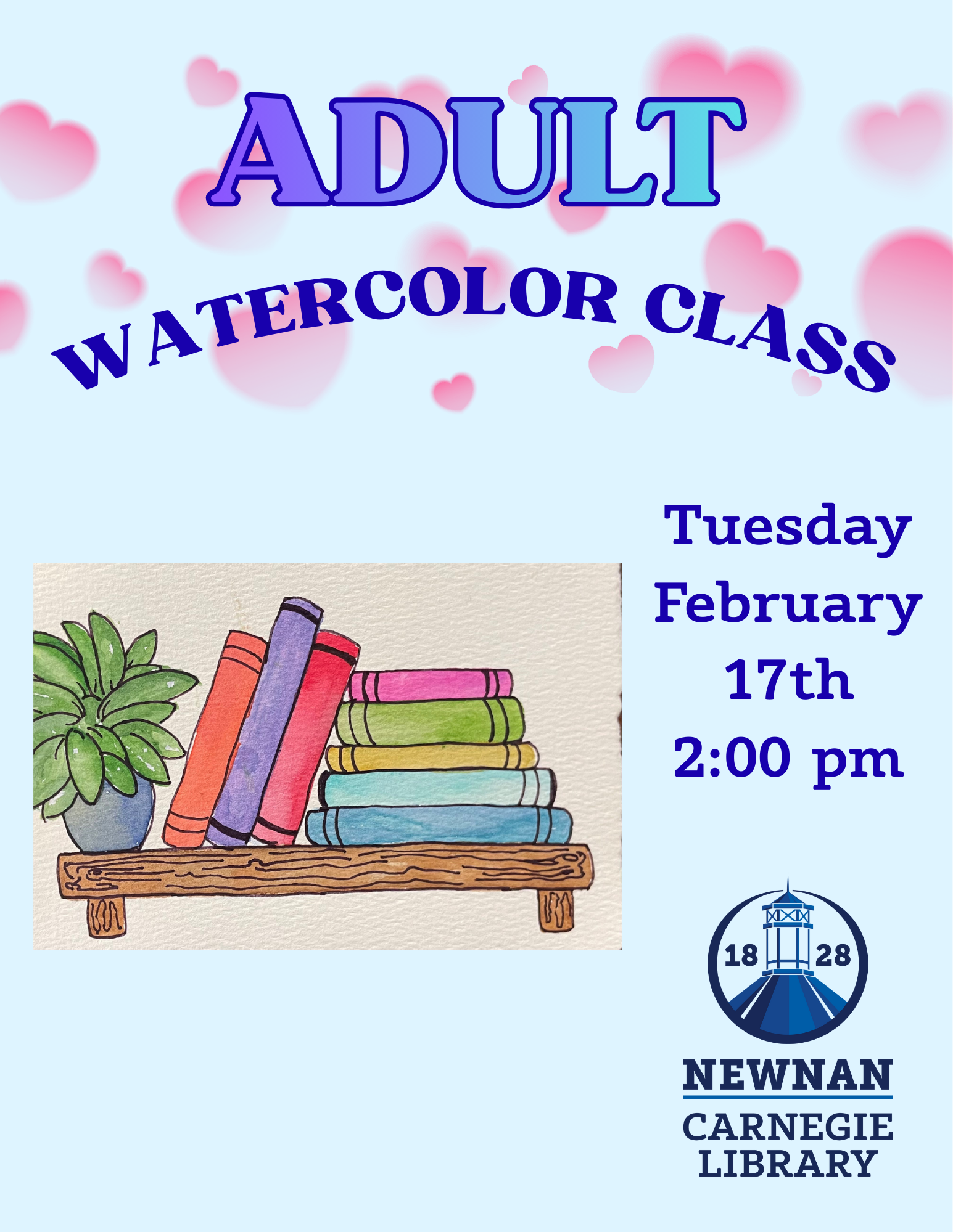 Please join Ms. Elizabeth at the Newnan Carnegie Library to practice watercolor skills. We will be painting a fun bookshelf painting while learning about layering watercolor for effect. These cute images can be used for cards or fun displays, however you'd like!