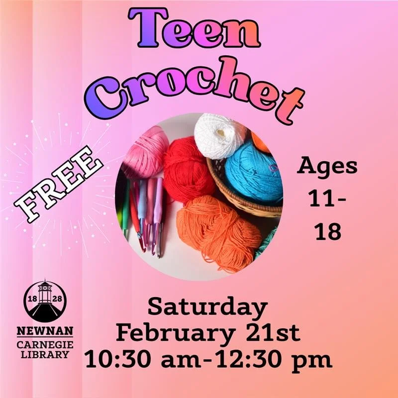 Join us at the Newnan Carnegie Library for our ongoing Teen Crochet Club. Free to the public for ages 11-18. We will have an instructor on hand to help beginners get started or to help you learn an advanced skill. Please bring a size H crochet hook and one skein of Red Heart yarn, or any project you are currently working on.