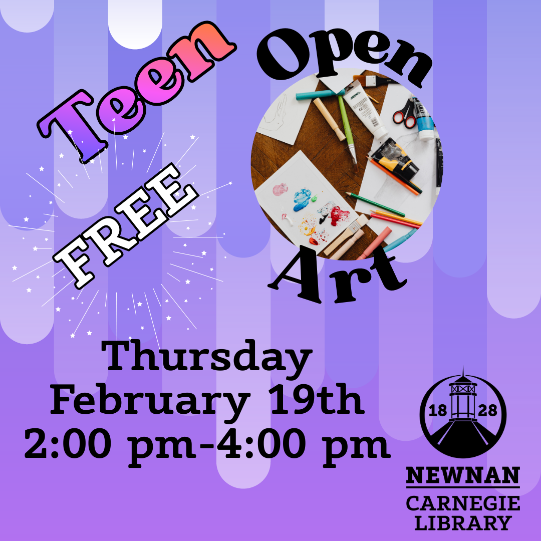 Teen Open Art! Ages 11-18. Come join us at the Newnan Carnegie Library for January's Teen Open Art. All supplies provided.