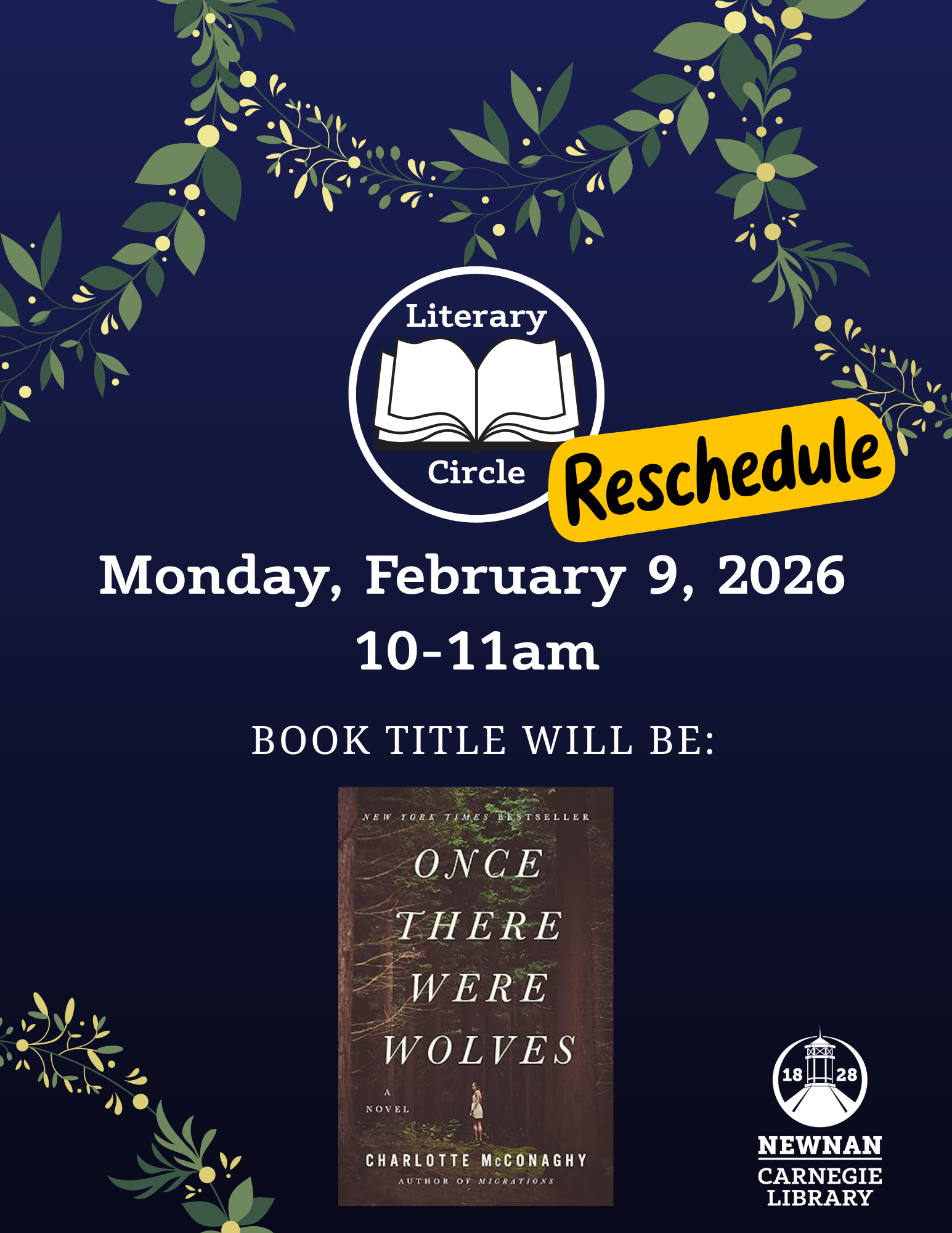 **RESCHEDULED: Join the Literary Circle Book Club at the Newnan Carnegie Library Monday, February 9th from 10:00am to 11:00am. The book title from January to be discussed is: Once There Were Wolves by Charlotte McConaghy.