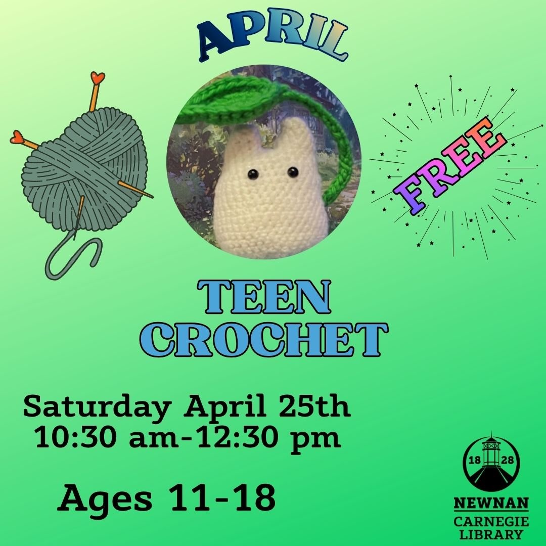 **Registration is recommended: https://www.eventbrite.com/e/april-teen-crochet-tickets-1986258812577 .