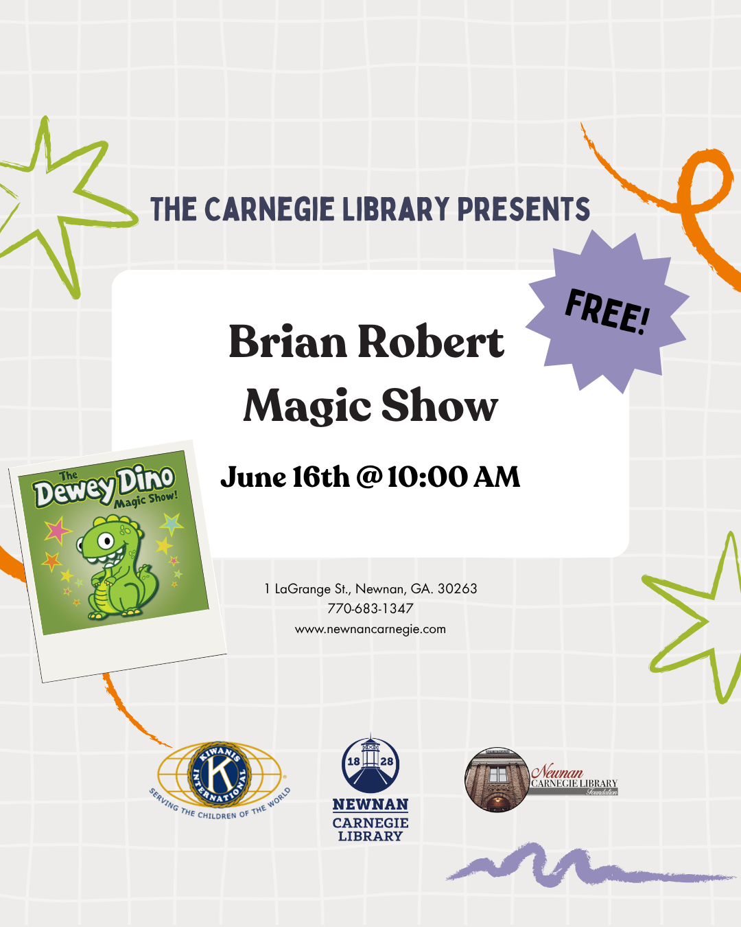 Magician Brian Robert and the Newnan Carnegie Library invite you to join Dewey and his friends as they unearth magical secrets and dig into why books are the best place to discover dinosaurs and their magical past. All ages are welcome! Space is limited. Registration is required and will begin on Eventbrite one week before the program. Sponsored by the Kiwanis Club of Newnan and the Newnan Carnegie Library Foundation.