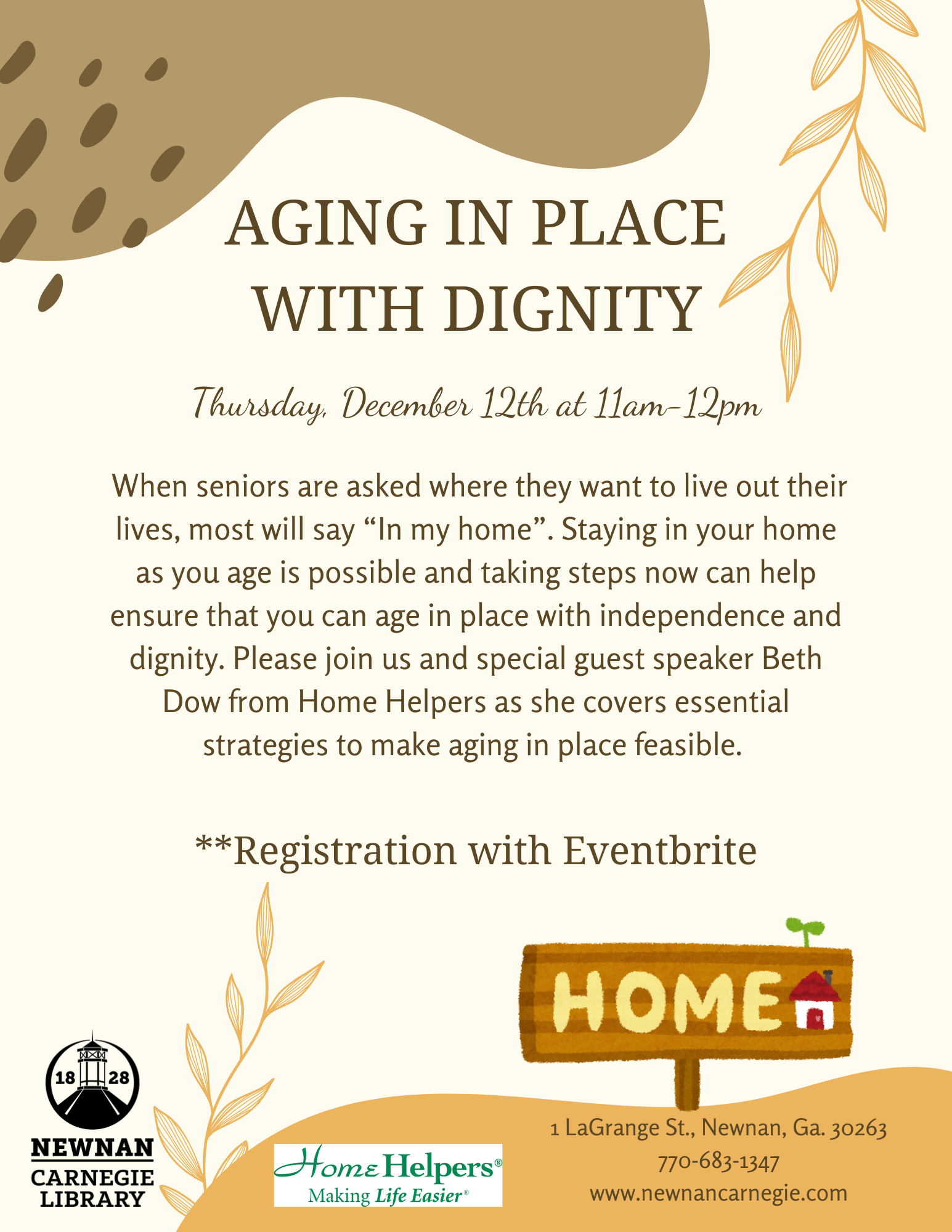 When seniors are asked where they want to live out their lives, most will say “In my home”. Staying in your home as you age is possible and taking steps now can help ensure that you can age in place with independence and dignity. Please join us and special guest speaker Beth Dow from Home Helpers as she covers essential strategies to make aging in place feasible.