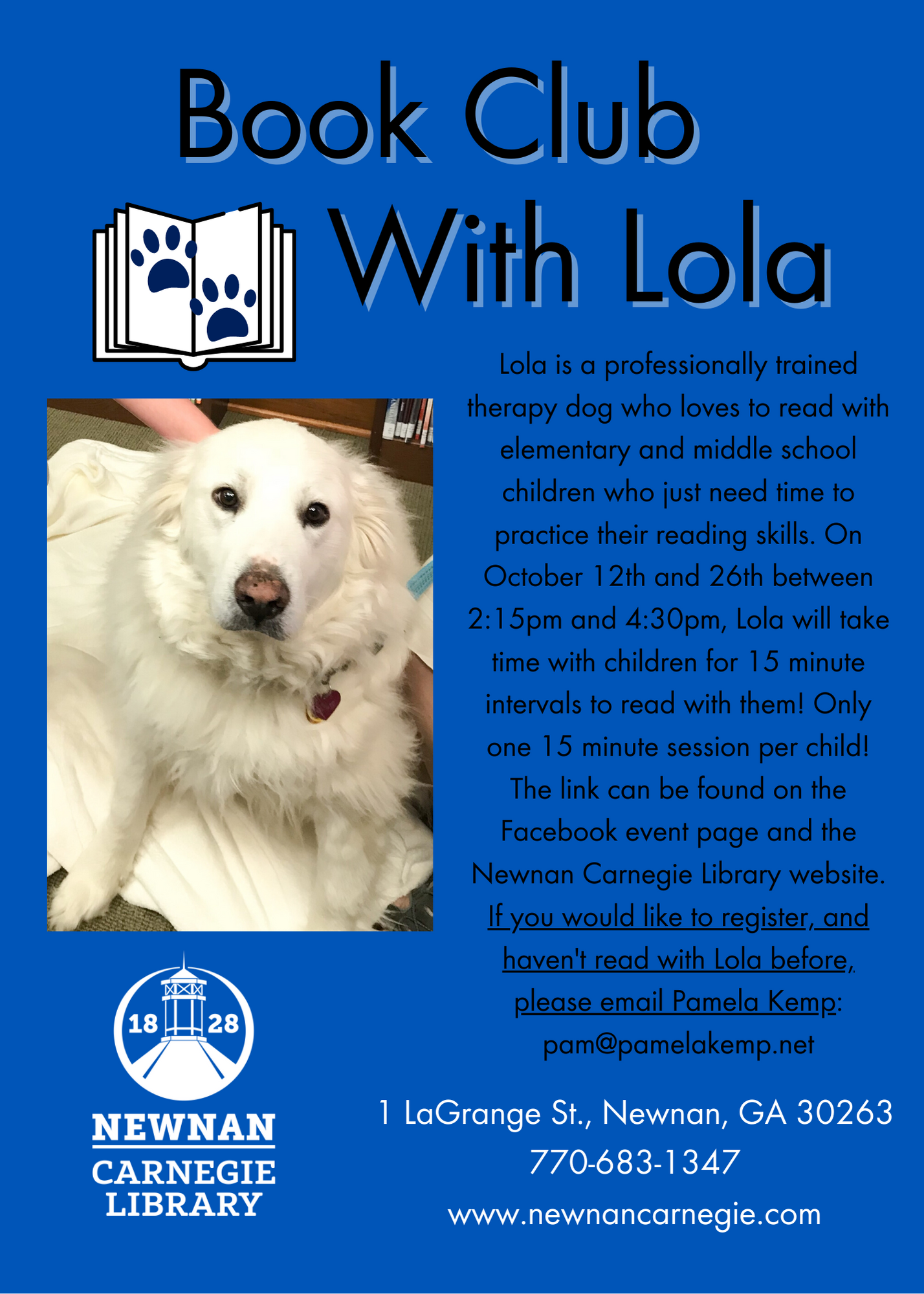 Lola, a registered therapy dog, and her handler, Ms. Pam, provides a free fifteen minute, private reading exercise for elementary and middle school aged students. You will register a 15 minute interval between 2:15-4:30pm for your child to have the opportunity to read a story with Lola in the Newnan Carnegie Library! You can only register one 15 minute session per child! A one time permission form is required to participate with Lola, so if your child has never read with Lola before, then you should arrive a few minutes before your registered session to read over the form and sign it.