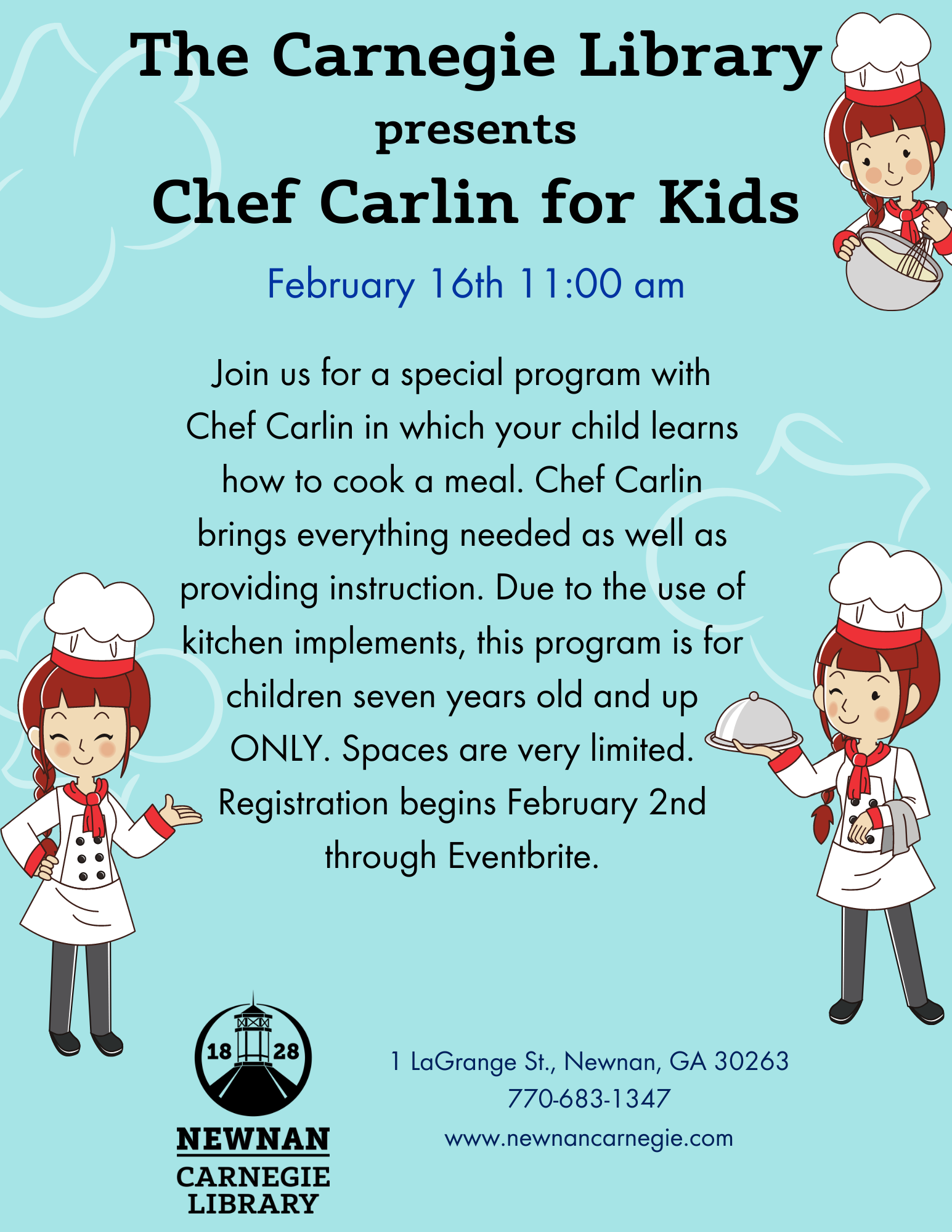 Join us for a special program with Chef Carlin in which your child learns how to cook a meal. Chef Carlin brings everything needed as well as providing instruction. Due to the use of kitchen implements, this program is for children seven years old and up ONLY. Spaces are very limited.