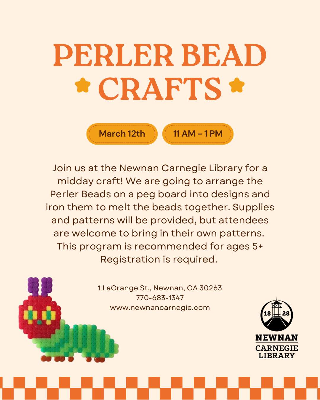 Join us at the Newnan Carnegie Library for a midday craft! We are going to arrange the Perler Beads on a peg board into designs and iron them to melt the beads together. Supplies and patterns will be provided, but attendees are welcome to bring in their own patterns. This program is recommended for ages 5+.