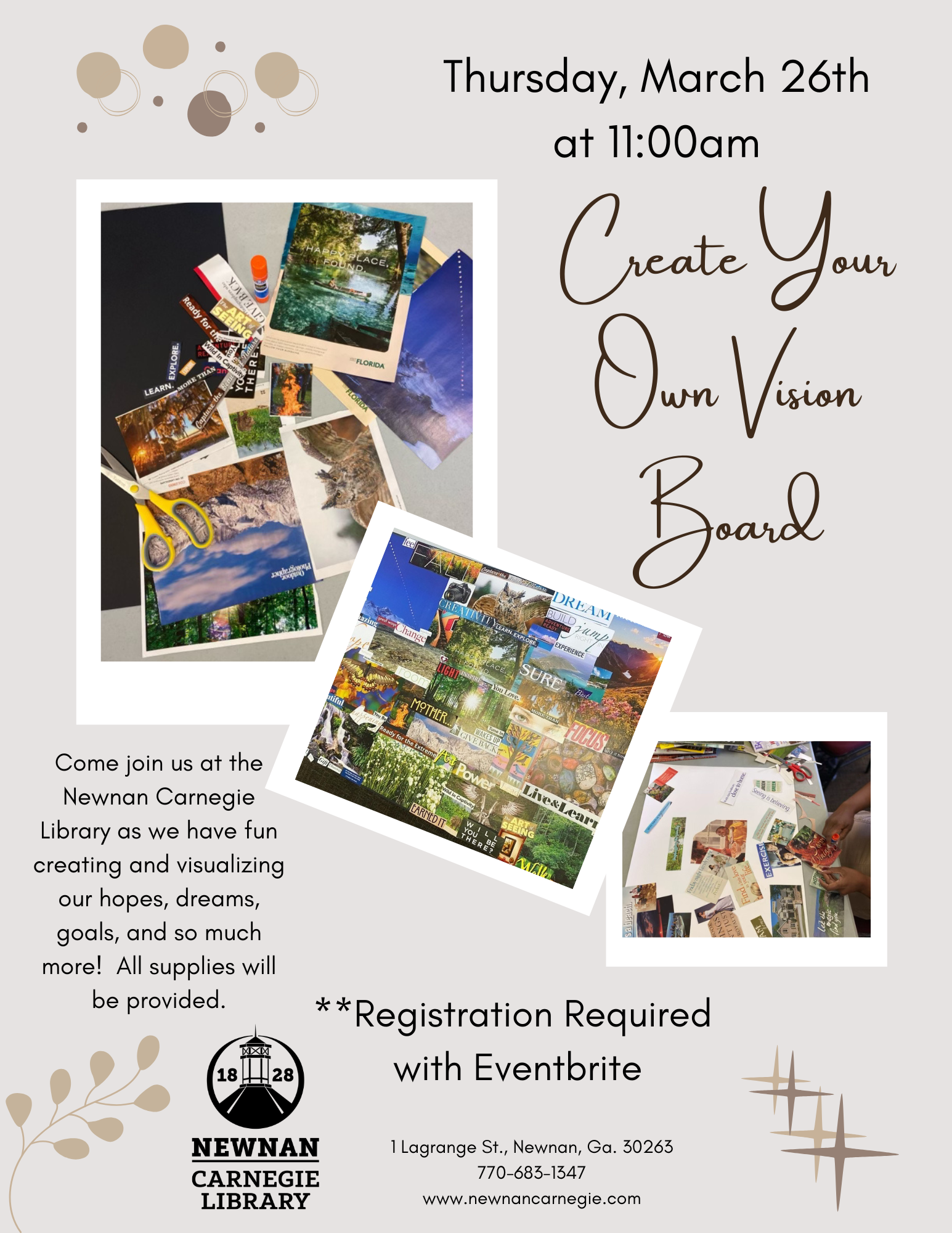 Come join us at the Newnan Carnegie Library as we have fun creating and visualizing our hopes, dreams, goals, and so much more with your very own vision board! All supplies will be provided. Adults ONLY.