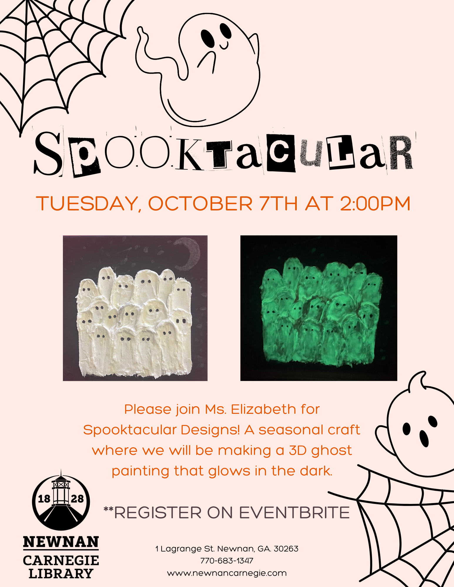 Please join Ms. Elizabeth for Spooktacular Designs! A seasonal craft where we will be making a 3D ghost painting that glows in the dark.