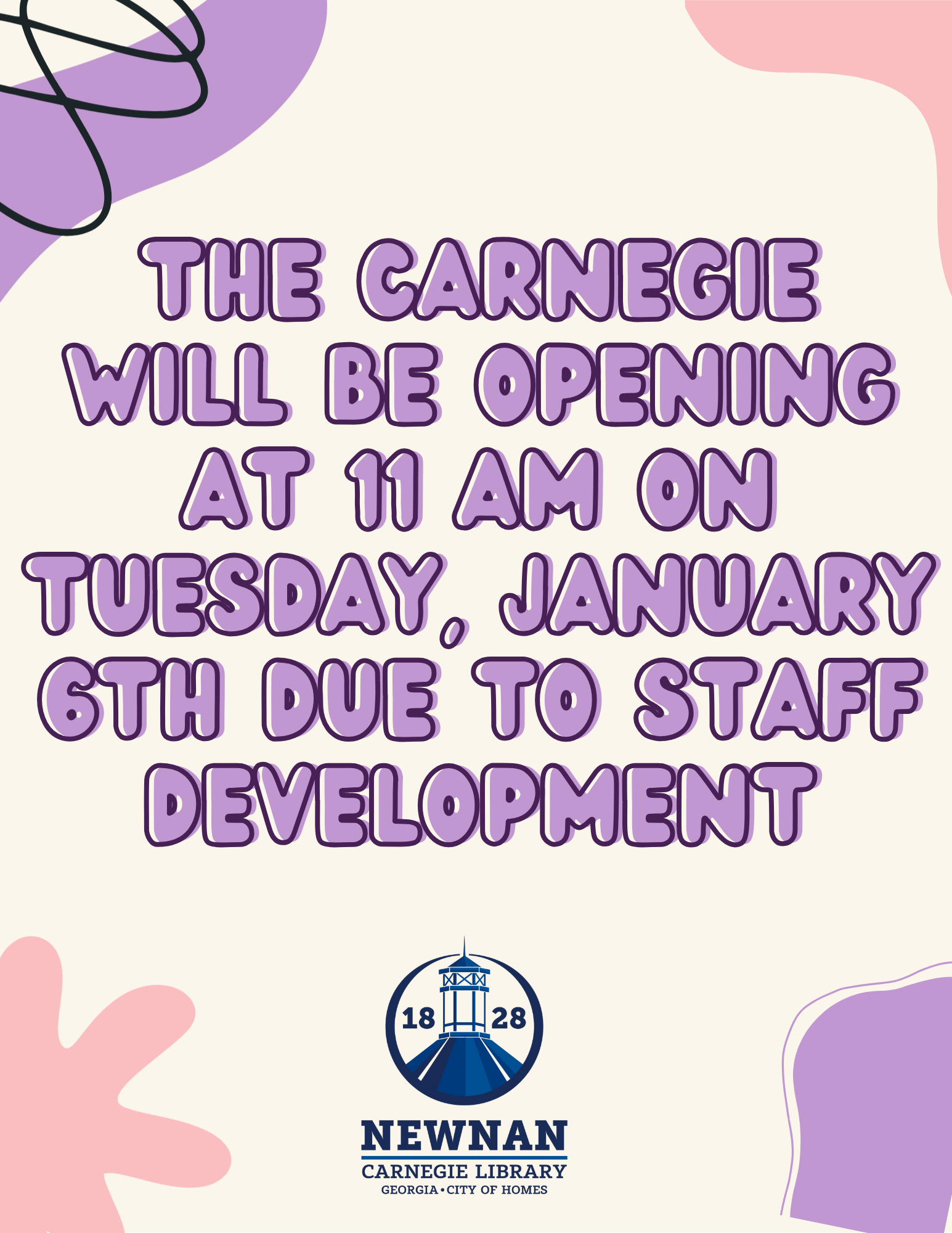 The Carnegie Library will be doing a delayed open on Tuesday, January 6th for Staff Development. We will be opening at 11 am.