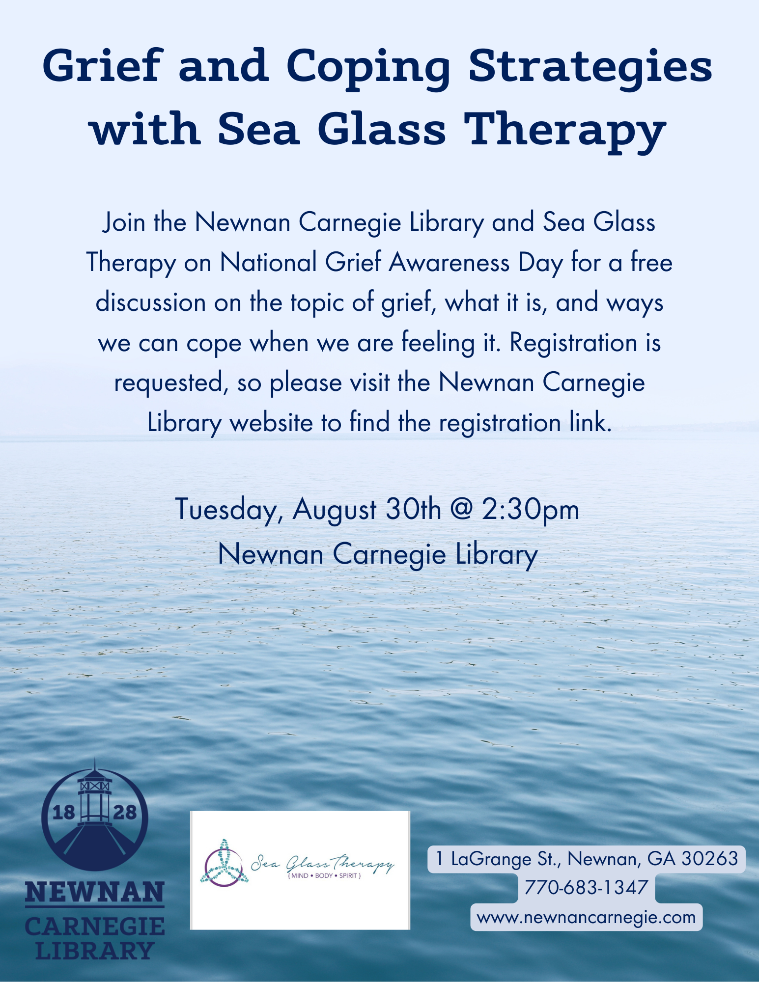 Grief and Coping Strategies with Sea Glass Therapy Tuesday, August 30, 2022 2:30 PM 4:00 PM Newnan Carnegie Library 1 Lagrange Street Newnan, GA, 30263 United States (map) Google Calendar ICS Join the Newnan Carnegie Library and Sea Glass Therapy on August 30th at 2:30pm, National Grief Awareness Day, for a free discussion on the topic of grief, what it is, and ways we can cope when we are feeling it.Register here!