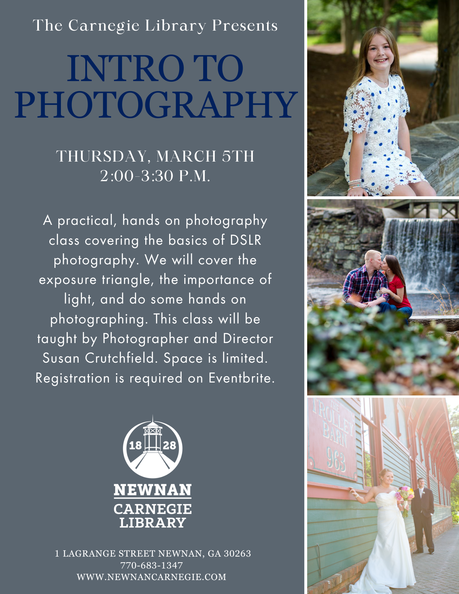 A practical, hands on photography class covering the basics of DSLR photography. We will cover the exposure triangle, the importance of light, and do some hands on photographing. This class will be taught by Photographer and Director Susan Crutchfield.