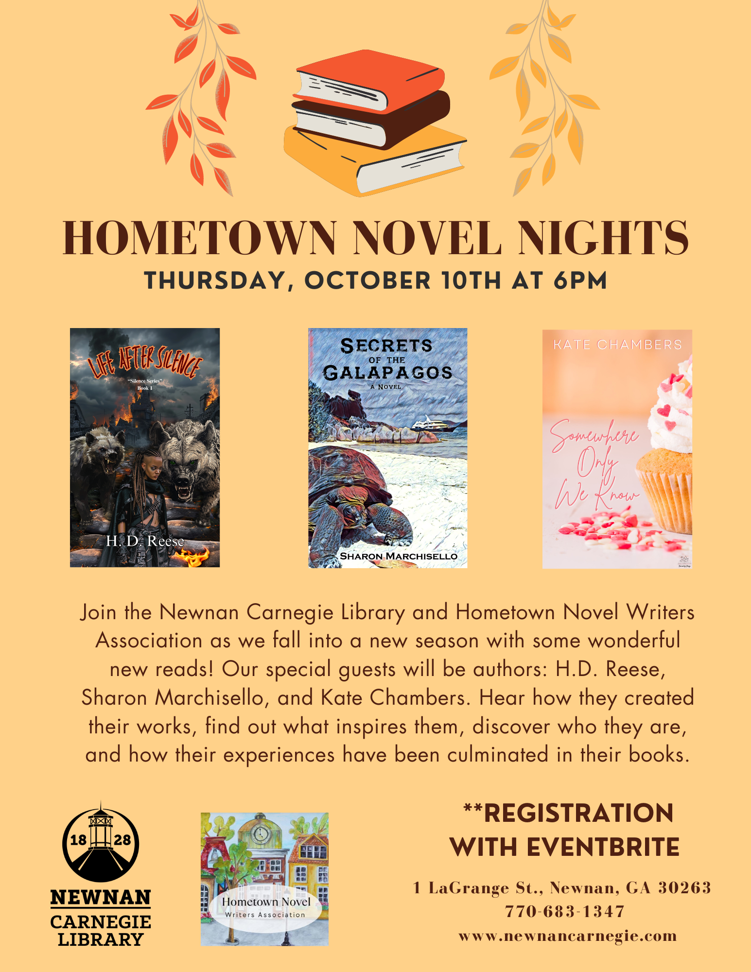Join the Newnan Carnegie Library and Hometown Novel Writers Association as we fall into a new season with some wonderful new reads! Our special guests will be authors: H.D. Reese, Sharon Marchisello, and Kate Chambers. Hear how they created their works, find out what inspires them, discover who they are, and how their experiences have been culminated in their books.