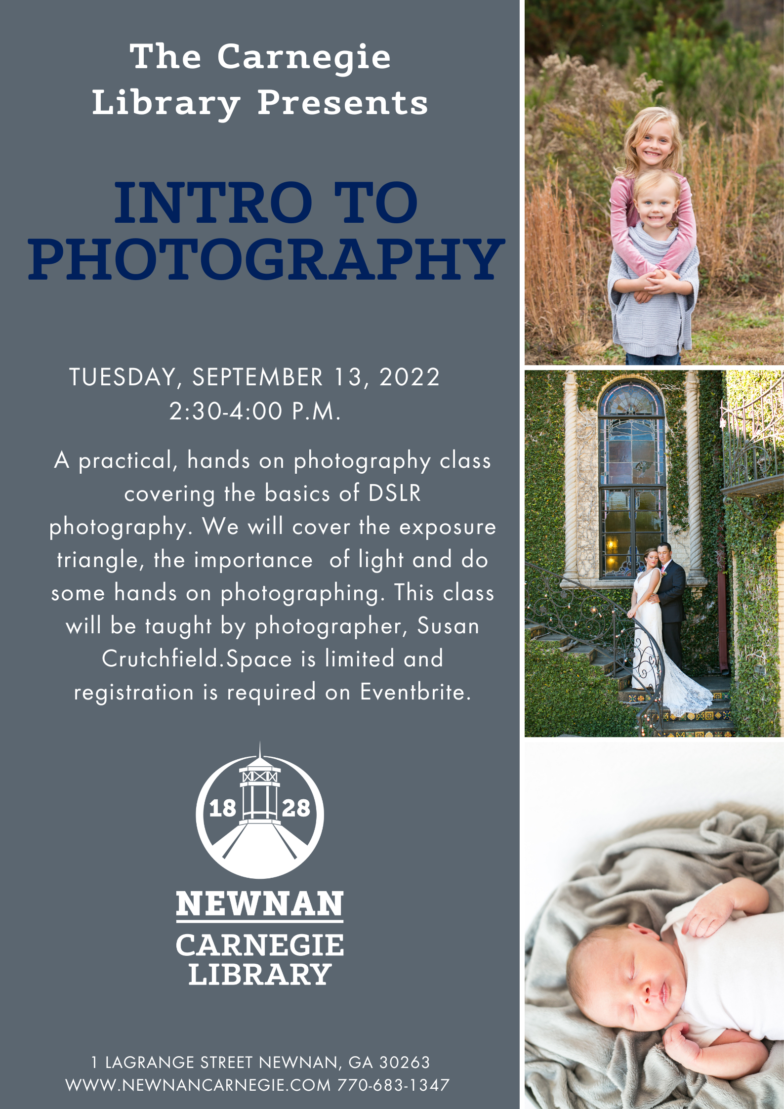 A practical, hands-on photography class covering the basics of DSLR photography. We will cover the exposure triangle, the importance of light and do some hands-on photographing. This class will be taught by photographer, Susan Crutchfield. Space is limited and registration is required on Eventbrite.
