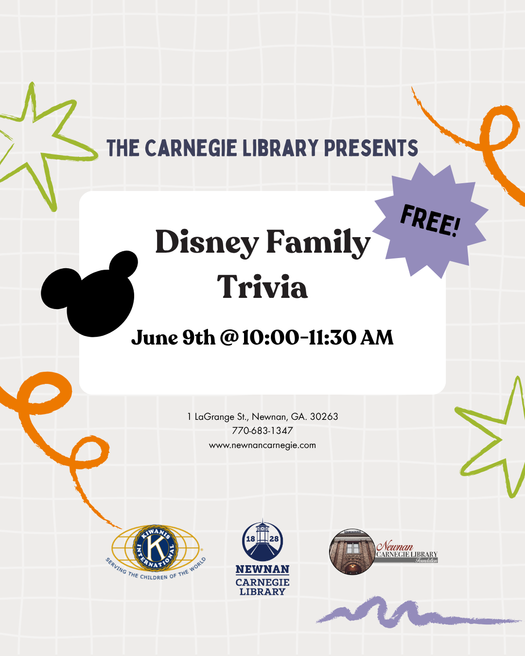 Join us at the Newnan Carnegie Library for Disney Family Trivia. We will work in teams to answer questions about all things Disney. Each member of the winning team will receive a prize. Space is limited. Registration is required and will begin on Eventbrite one week before the program. Sponsored by the Kiwanis Club of Newnan and the Newnan Carnegie Library Foundation.