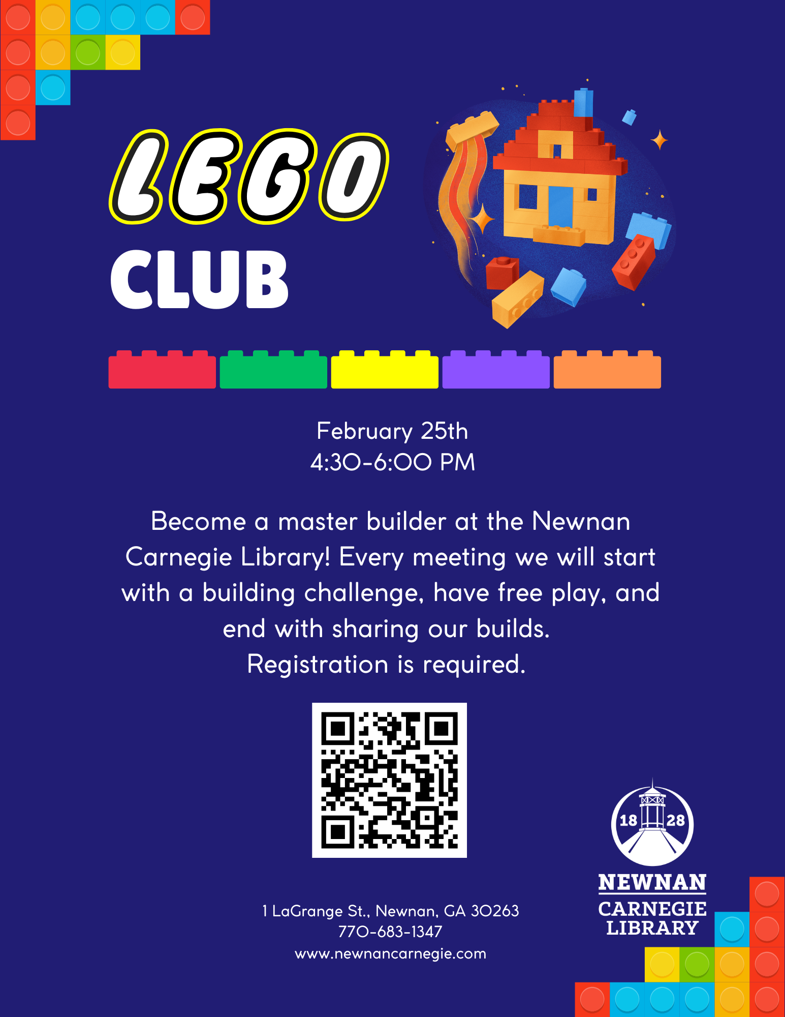 Become a master builder at the Newnan Carnegie Library! Every meeting we will start with a building challenge, have free play, and end with sharing our builds.