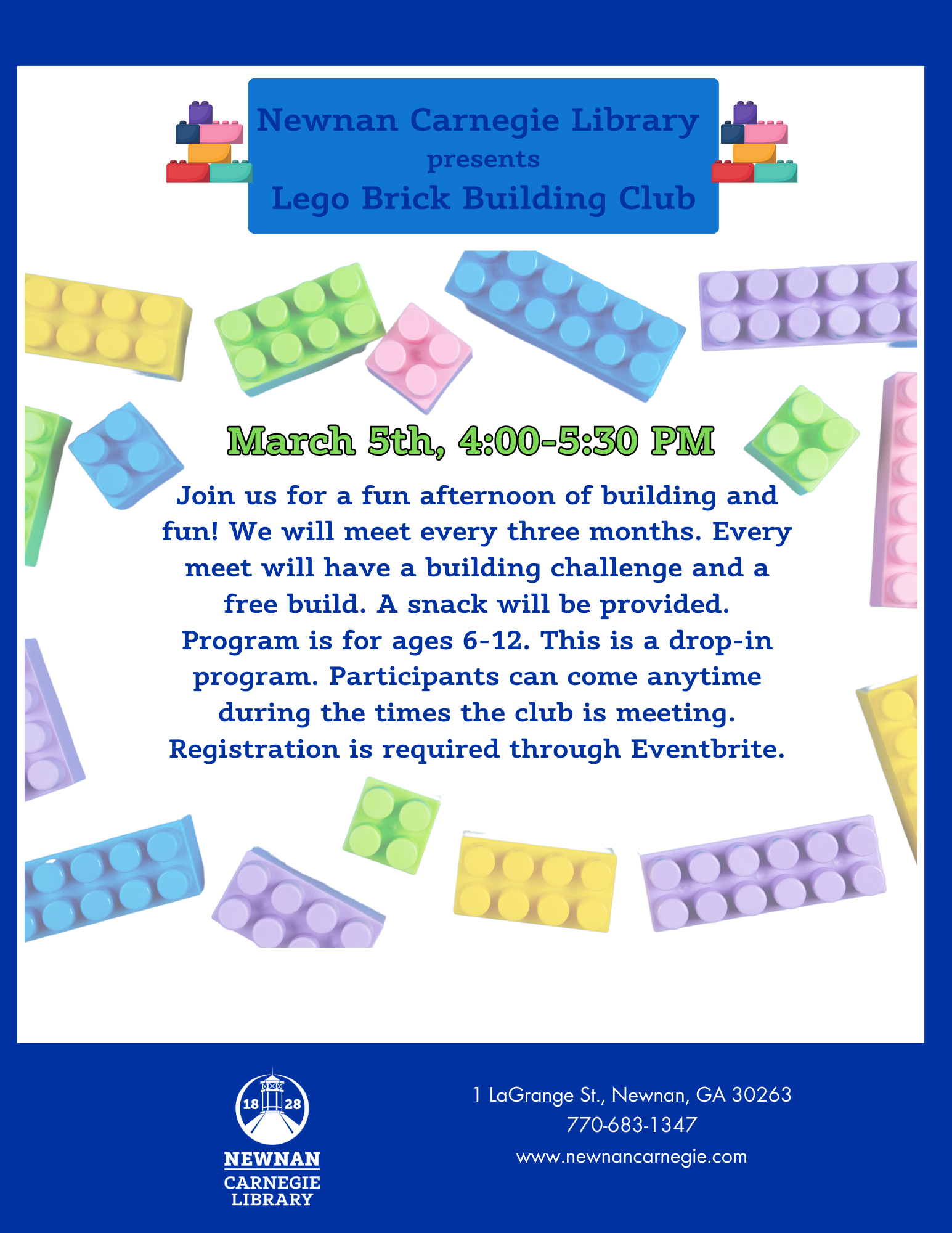 Join us for a fun afternoon of building and fun! We will meet every three months. Every meet will have a building challenge and a free build. A snack will be provided. Program is for ages 6-12. This is a drop-in program. Participants can come anytime during the times the club is meeting.