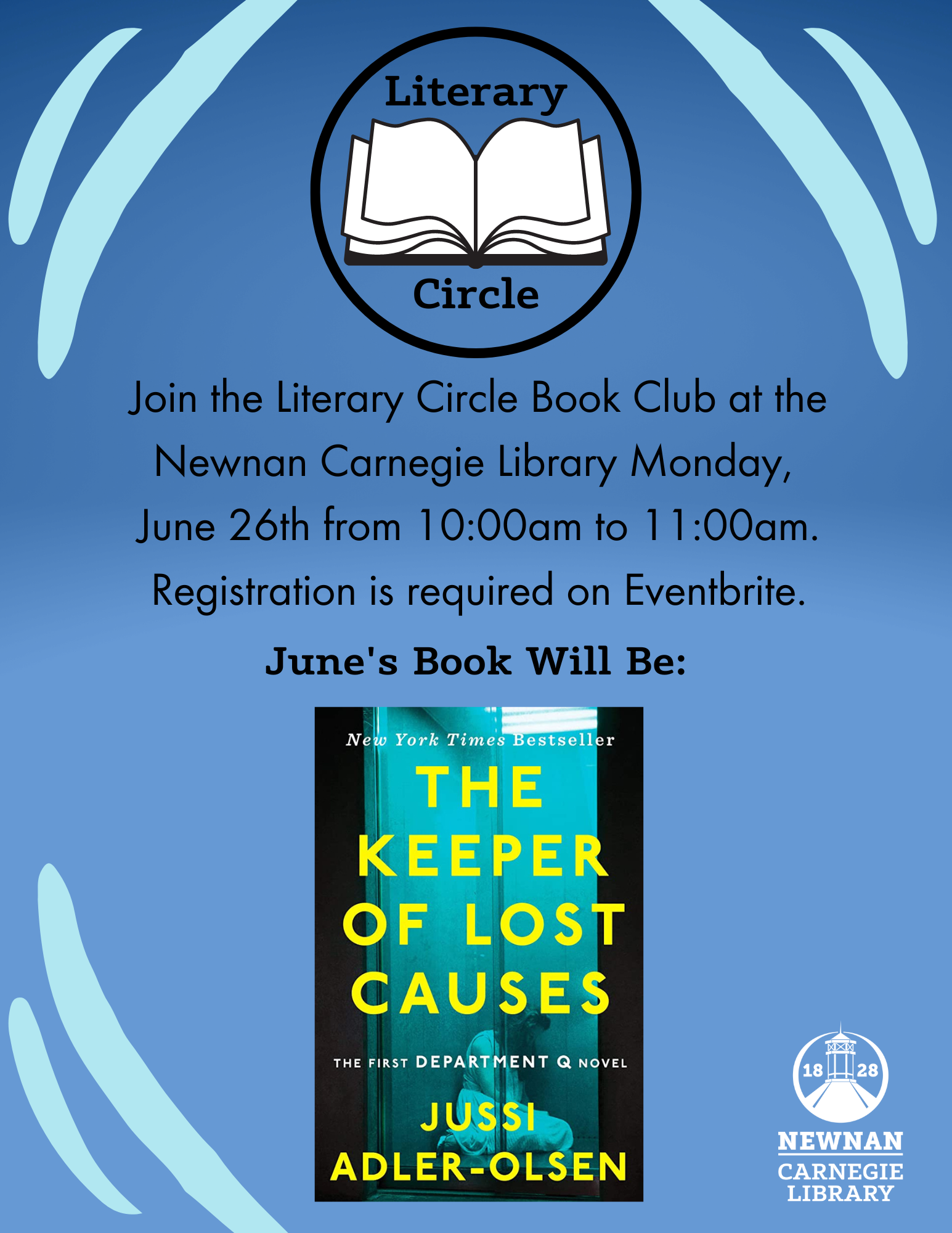 Join the Literary Circle Book Club at the Newnan Carnegie Library Monday, June 26th from 10:00am to 11:00am. June’s book title will be: The Keeper of Lost Causes by Jussi Alder-Olsen. Registration is required on Eventbrite at: https://www.eventbrite.com/e/634832239317 .