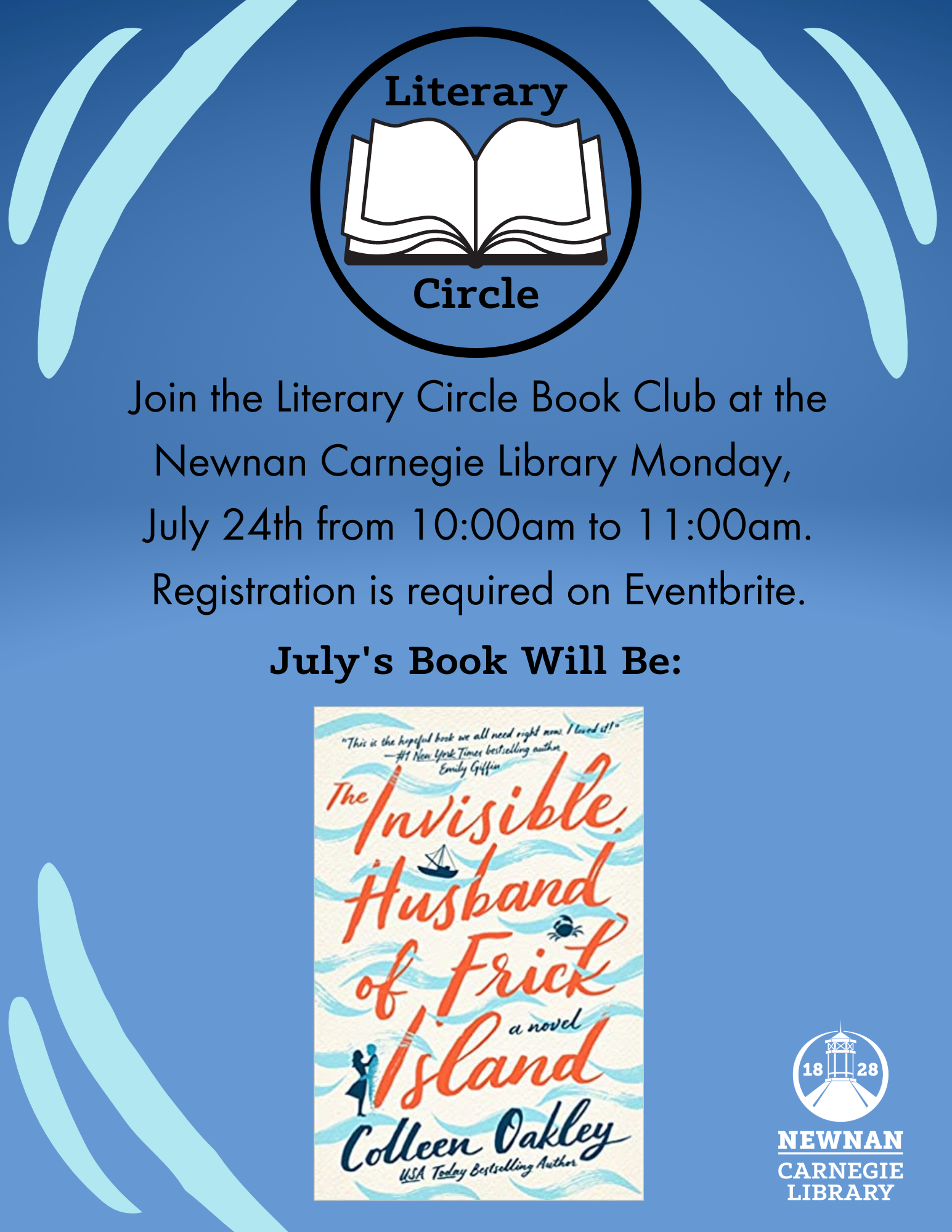 Join the Literary Circle Book Club at the Newnan Carnegie Library Monday, July 24th from 10:00am to 11:00am. July’s book title will be: The Invisible Husband of Frick Island by Colleen Oakley.