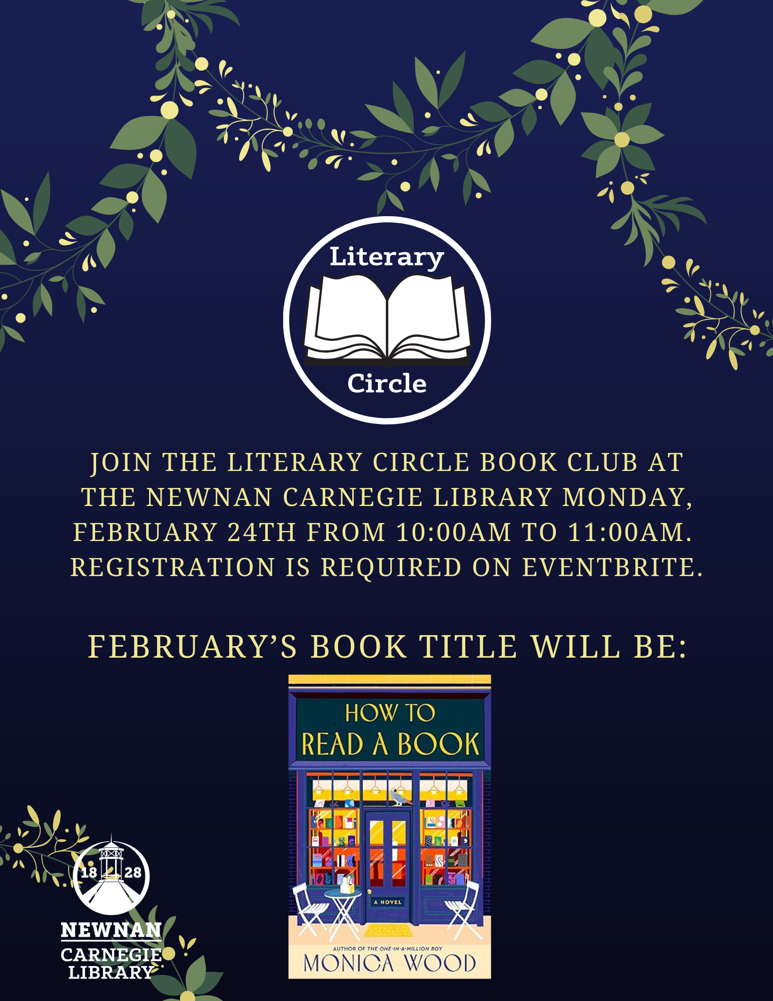 Join the Literary Circle Book Club at the Newnan Carnegie Library Monday, February 24th from 10:00am to 11:00am. February’s book title will be: How to Read a Book by Monica Wood.