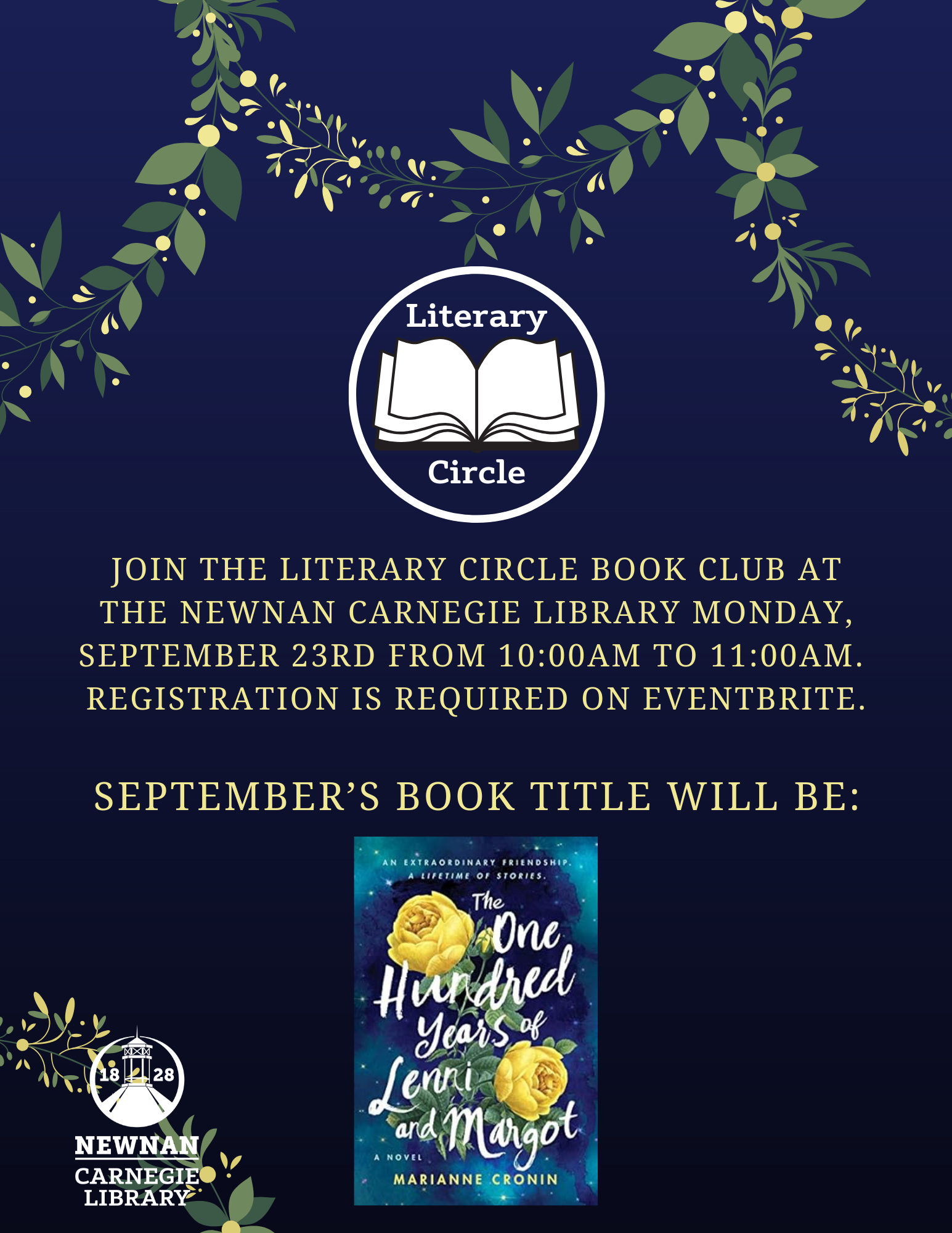 Join the Literary Circle Book Club at the Newnan Carnegie Library Monday, September 23rd from 10:00am to 11:00am. September’s book title will be: The 100 Years of Lenni and Margo by Marianne Cronin.
