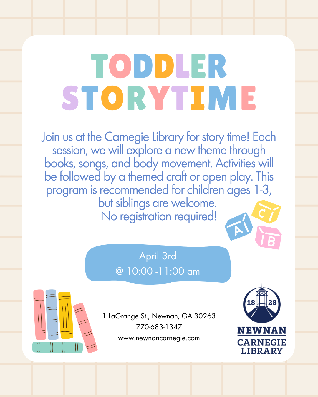 Join us at the Carnegie Library for story time! Each session, we will explore a new theme through books, songs, and body movement. Activities will be followed by a themed craft or open play. This program is recommended for children ages 1-3, but siblings are welcome.