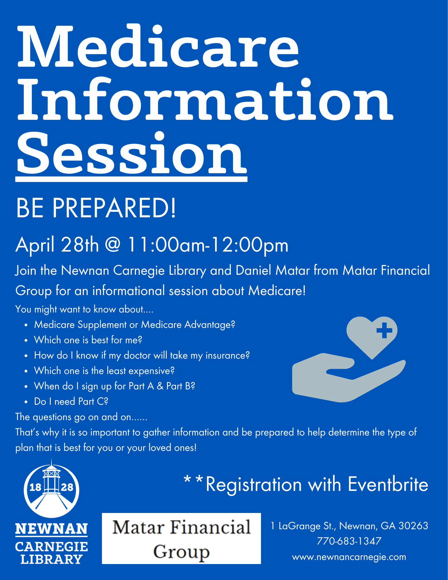 Be prepared! On Tuesday, April 28th @11:00am-12:00pm please join the Newnan Carnegie Library and Daniel Matar with Matar Financial Group for an informational session about Medicare!