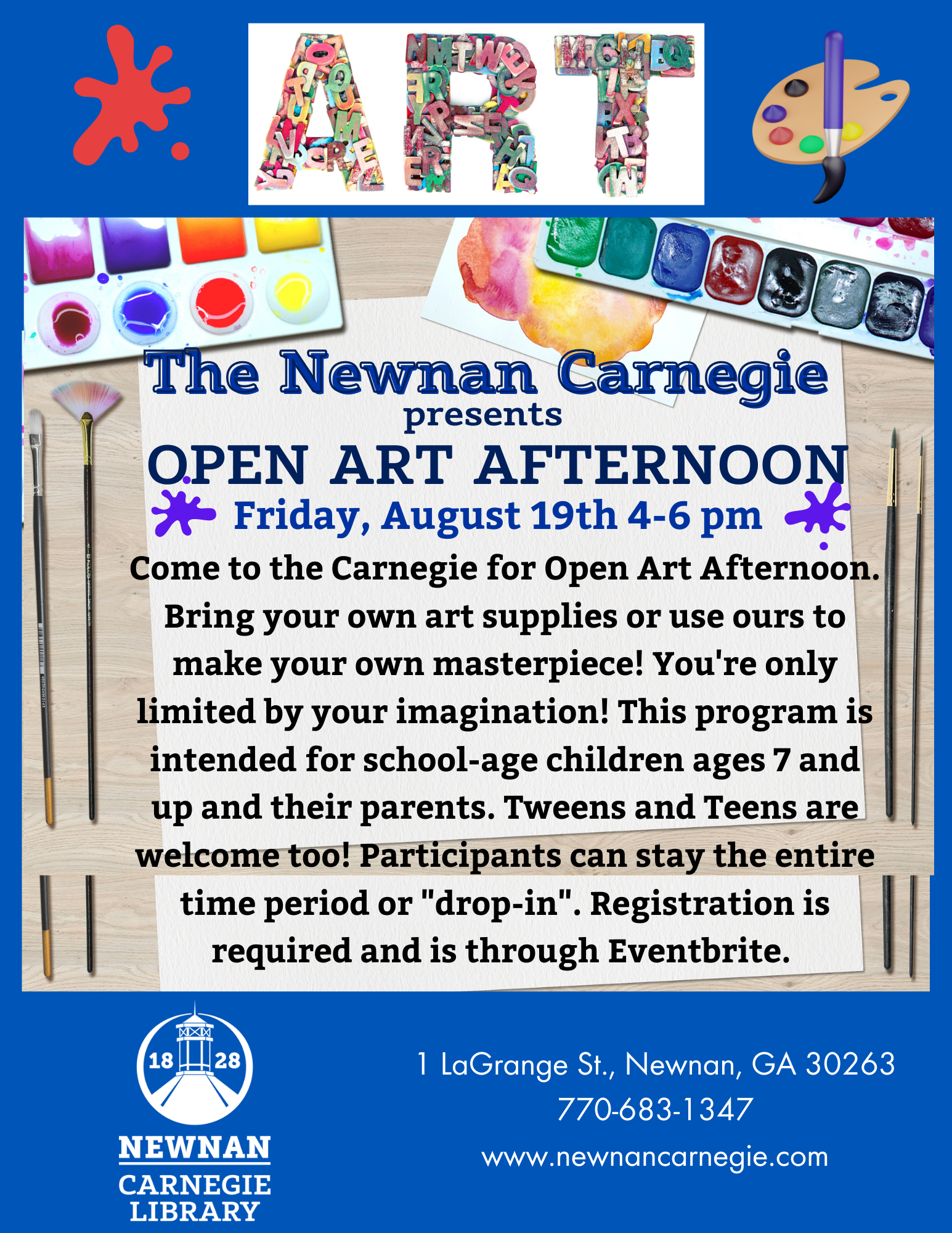 Come to the Carnegie for Open Art Afternoon. Bring your own art supplies or use ours to make your own masterpiece! You're only limited by your imagination! This program is intended for school-age children ages 7 and up and their parents. Tweens and Teens are welcome too! Participants can stay the entire time period or "drop-in". A variety of materials will be on hand such as acrylic, watercolor, and tempura paints. some watercolor pencils (very limited supply), markers (permanent and washable), paint pens, rocks for painting (very limited supply), canvas panels, various odds and ends to paint on such as cardboard, cardstock, construction paper, etc. various odds and ends to make multimedia pieces such as glue guns, newspaper, buttons, ribbons, some beads, straw pieces, and more. Please do not bring spray paint, oil paints, or glitter.