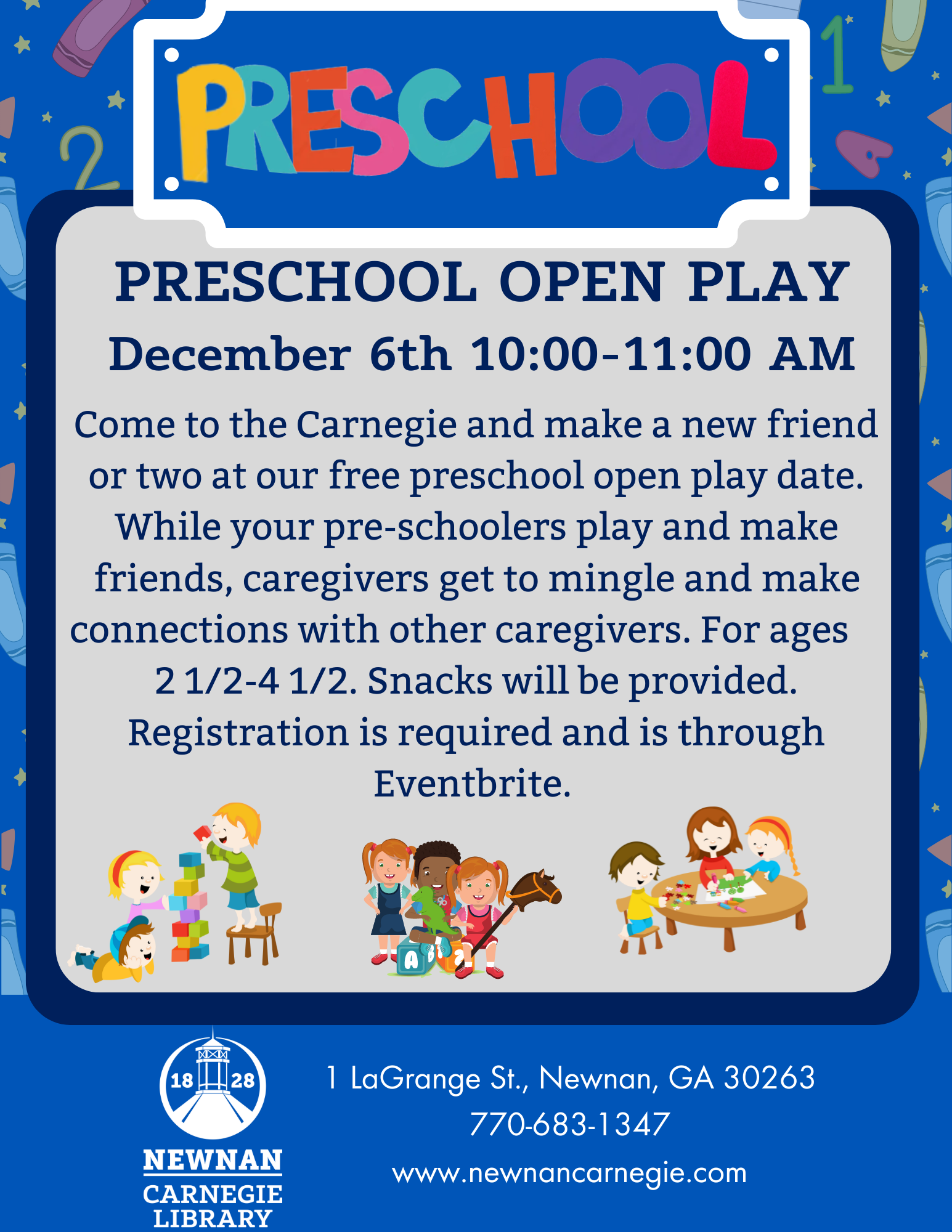 Come to the Carnegie and make a new friend or two at our free preschool open play date. While your pre-schoolers play and make friends, caregivers get to mingle and make connections with other caregivers. For ages 2 1/2-4 1/2. Snacks will be provided. Registration is required and is through Eventbrite: https://www.eventbrite.com/e/427898825907