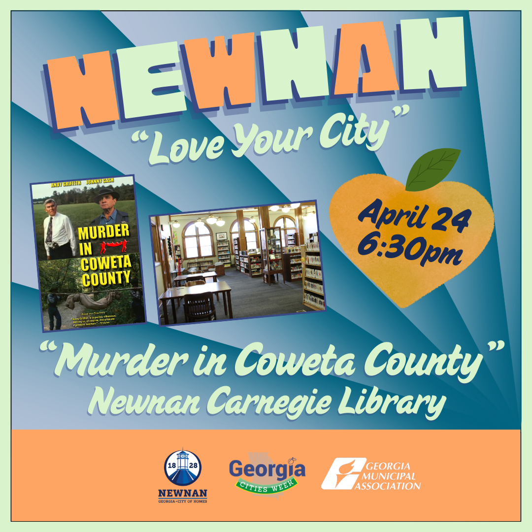 Happy Georgia Cities Week! On April 24, 2026 at 6:30pm at the Newnan Carnegie Library, join the City of Newnan and the Newnan Carnegie Library for a free showing of the 1983 made-for-television film "Murder in Coweta County." Enjoy popcorn at the Carnegie while viewing this classic film.