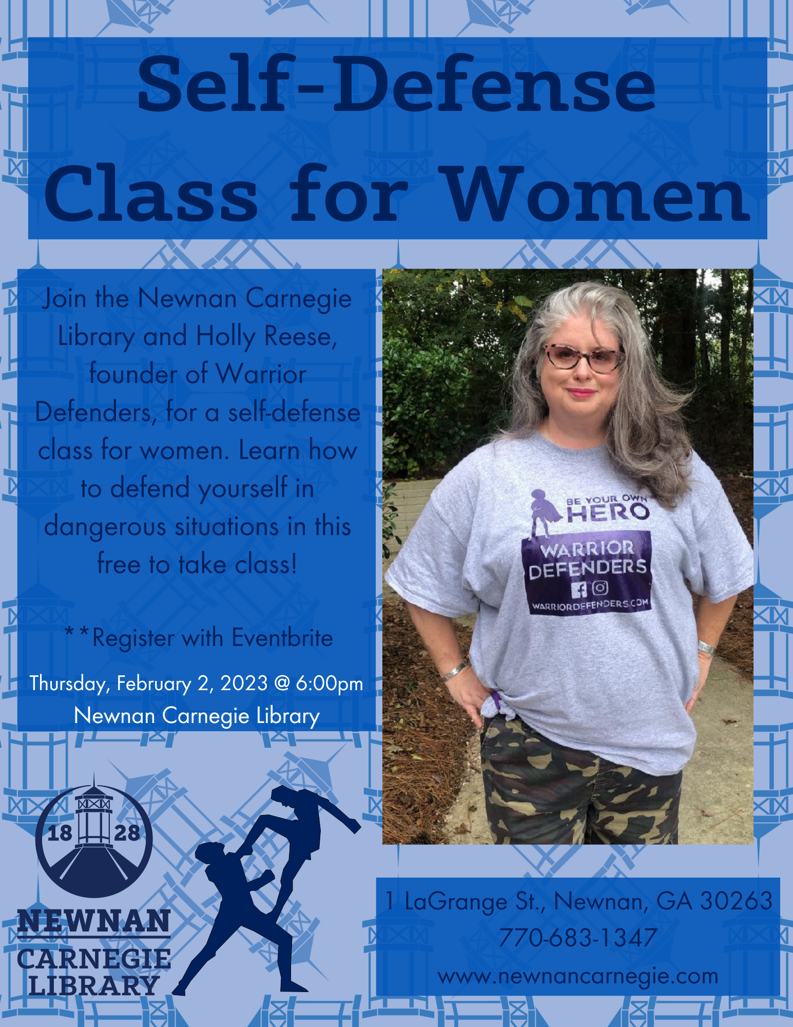 Join the Newnan Carnegie Library and Holly Reese, founder of Warrior Defenders, for a self-defense class for women. Learn how to defend yourself in dangerous situations in this free to take class!