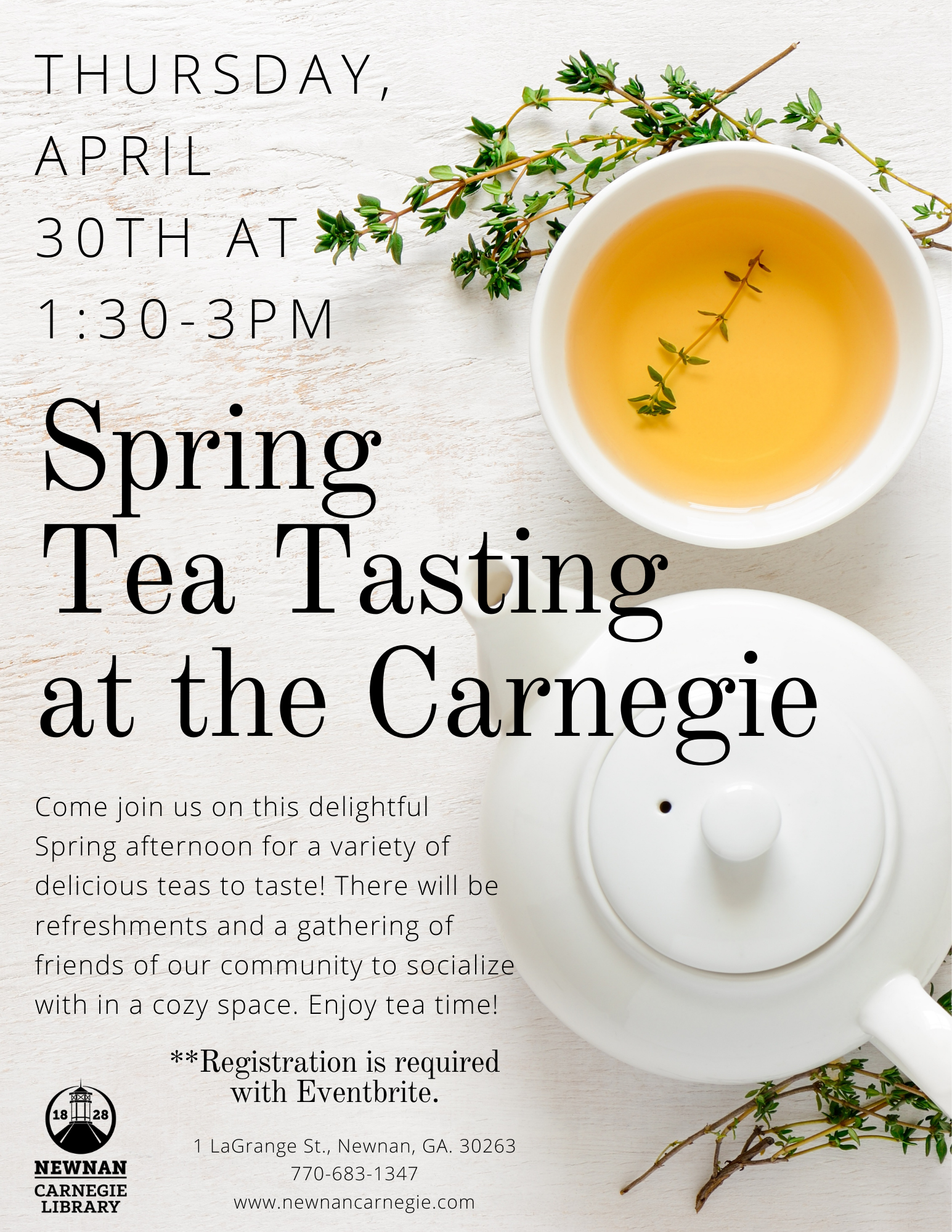Come join us on this delightful Spring afternoon for a variety of delicious teas to taste! There will be refreshments and a gathering of friends of our community to socialize with in a cozy space. Dress up or wear a fancy hat if you’d like, have fun, and simply enjoy tea time!