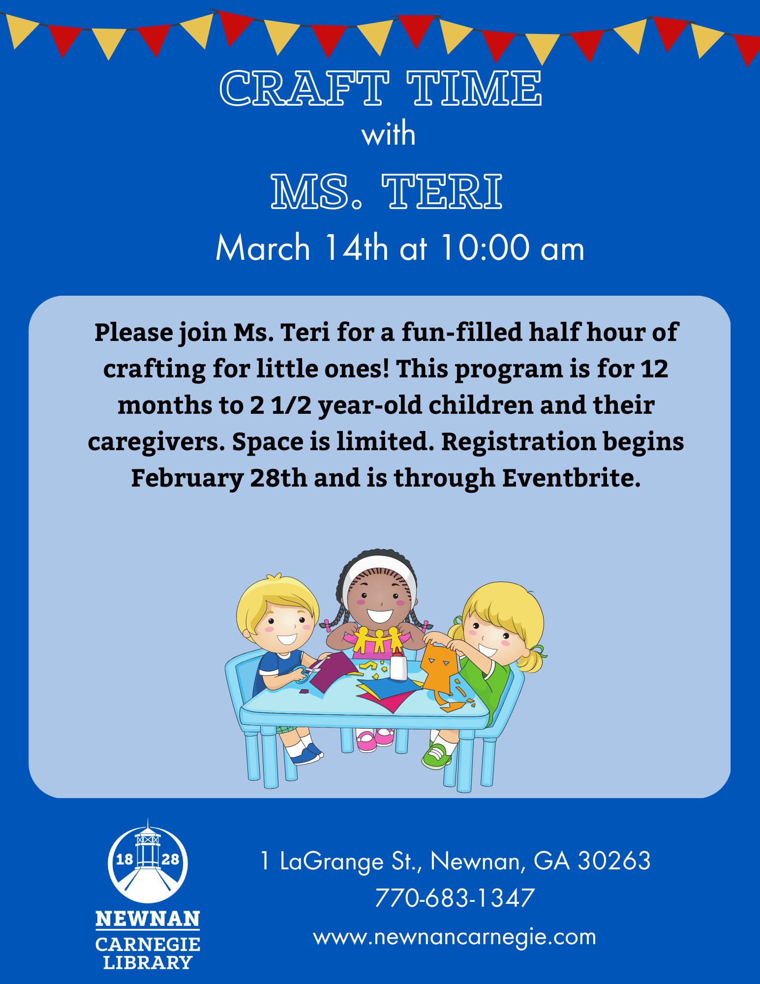 Please join Ms. Teri for a fun-filled half hour of crafting for little ones! This program is for 12 months to 2 1/2 year-old children and their caregivers. Space is limited.