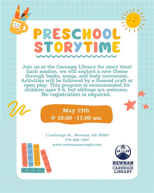Join us at the Carnegie Library for story time! Each session, we will explore a new theme through books, songs, and body movement. Activities will be followed by a themed craft or open play. This program is recommended for children ages 3-6, but siblings are welcome.