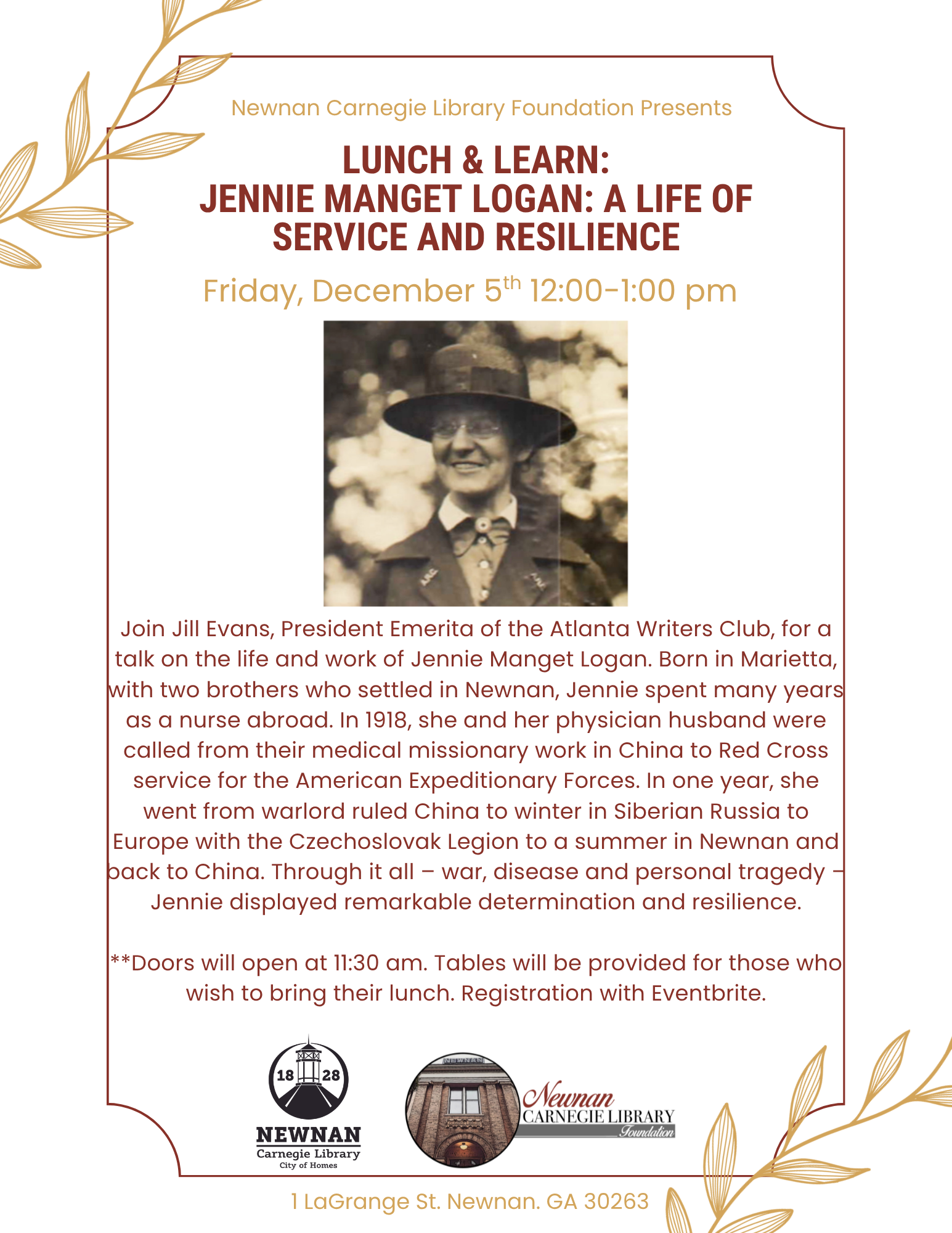Please join the Carnegie Library and the Newnan Carnegie Library Foundation for a talk and presentation by Jill Evans, President Emerita of the Atlanta Writers Club, on the life and work of Jennie Manget Logan. Born in Marietta, with two brothers who settled in Newnan, Jennie spent many years as a nurse abroad. In 1918, she and her physician husband were called from their medical missionary work in China to Red Cross service for the American Expeditionary Forces. In one year, she went from warlord ruled China to winter in Siberian Russia to Europe with the Czechoslovak Legion to a summer in Newnan and back to China. Through it all – war, disease and personal tragedy – Jennie displayed remarkable determination and resilience.